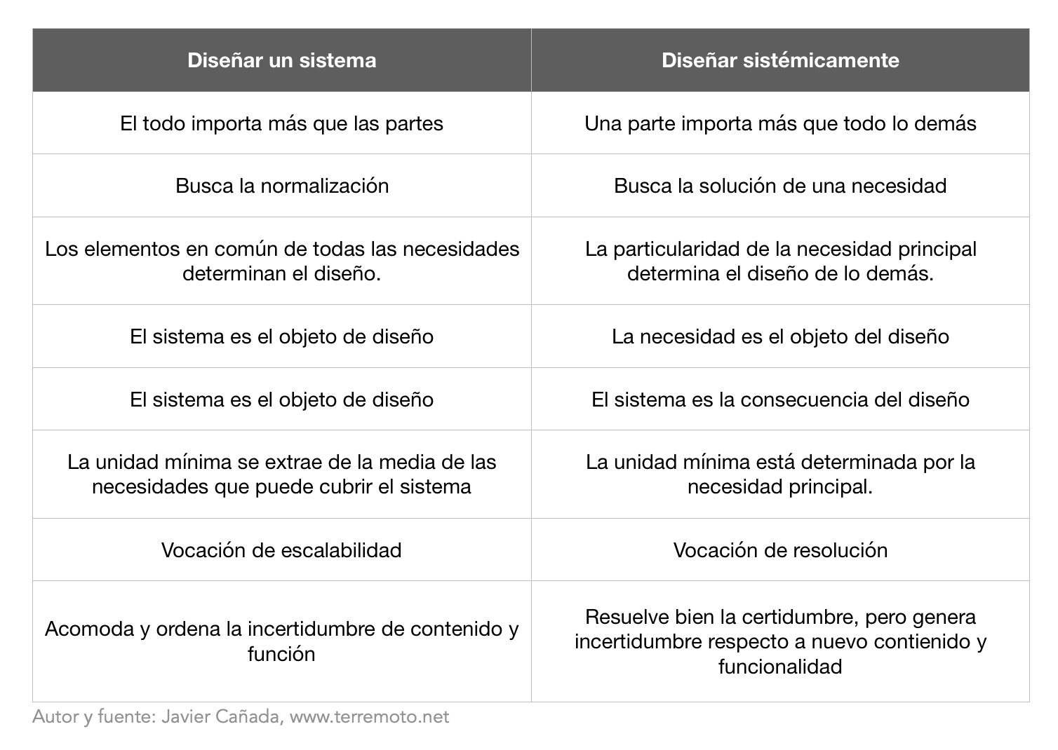 Hoy me han preguntado en twitter acerca de la diferencia entre crear un sistema de diseño y diseñar sistémicamente, que obviamente no es lo mismo. Es algo de lo que hablé hace algún tiempo pero, precisamente por lo efímero de las redes sociales, se debió evaporar en algún borrado de tuits. Voy a ver si soy capaz de sintetizar la idea en unos párrafos.