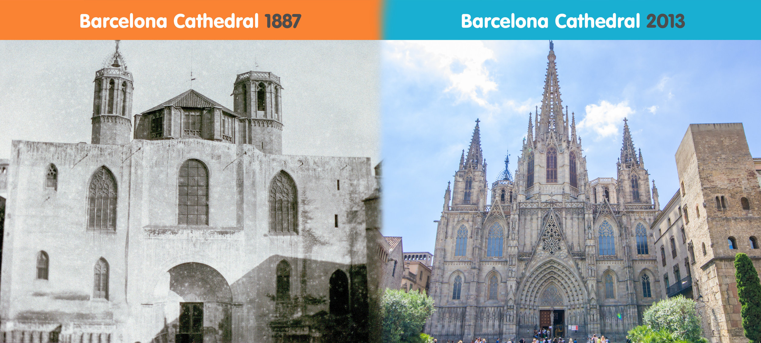 Aquí va un ejemplo es-can-da-lo-so que ilustra muy bien lo que describo: el Barri Gòtic de Barcelona, un barrio con apenas edificios originales del gótico, que en el s.XIX se te acondiciona completamente para evocar algo que realmente no fue, pero que enlaza con la idealización de lo que habría gustado que fuese: